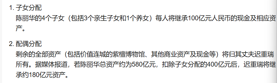 陈丽华的四名子女,各继承100亿现金及相应资产,剩余资产归丈夫迟重瑞,也就是,唐僧大概能分到180亿。