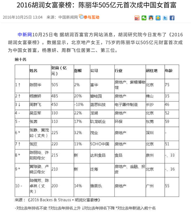 最巅峰的时候,75岁的陈丽华,以505亿财富值登上了2016年胡润中国女首富。
